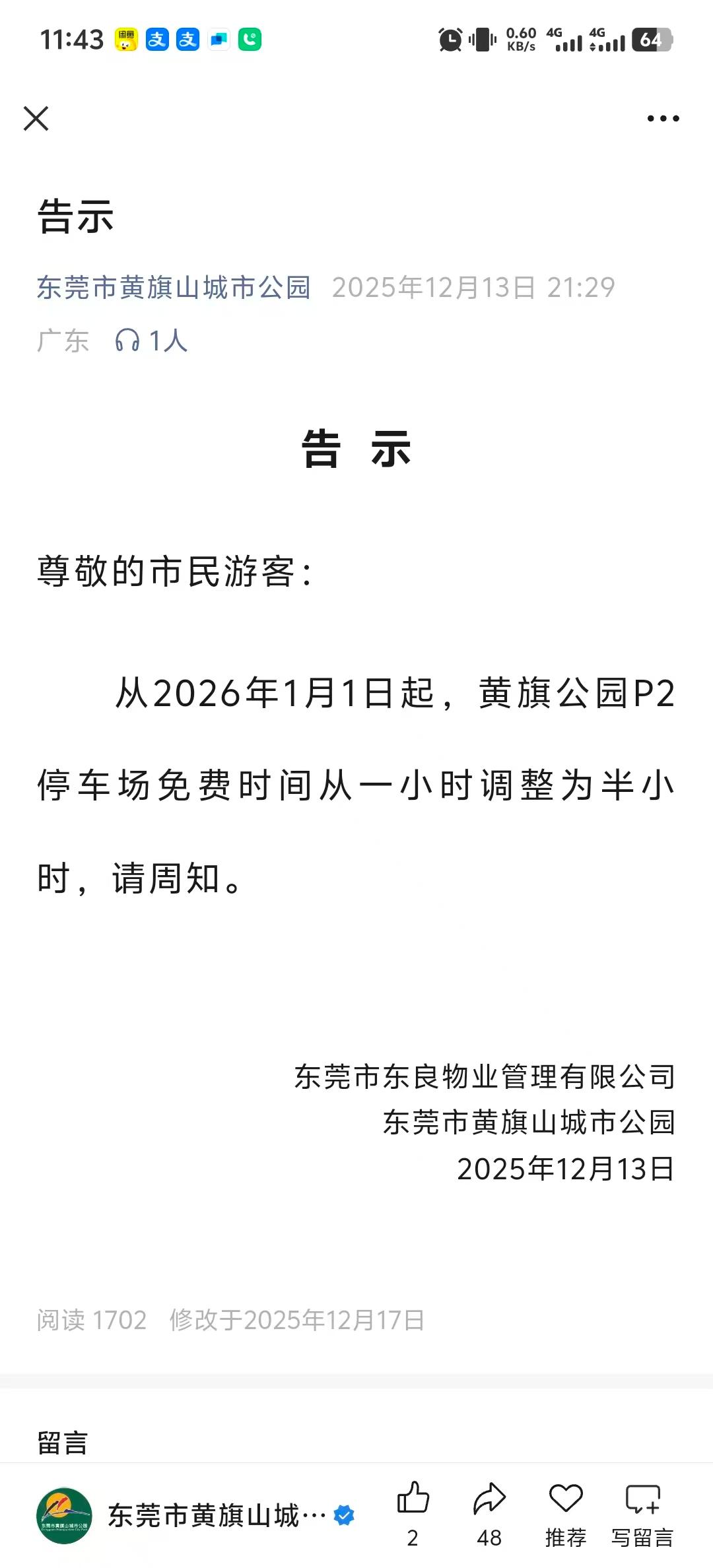 尊敬的市民您好!您反映的问题我司已收悉,情况回复如下:1、我司根据东发改【2019】468号文按政府指导价收取该停车场停车费,免费时长30分钟符合该文件标准。 2、相关公示发布在公园公众号及现场告示牌,之前公示时长未够,我司已进行整改,现公示到2026年1月1日开始免费停车时长调整为30分钟。 3、如有其它疑问可联系停车场电话:0769-22250888。 给您带来不便深感抱歉,感谢您对我司工作的理解和支持!