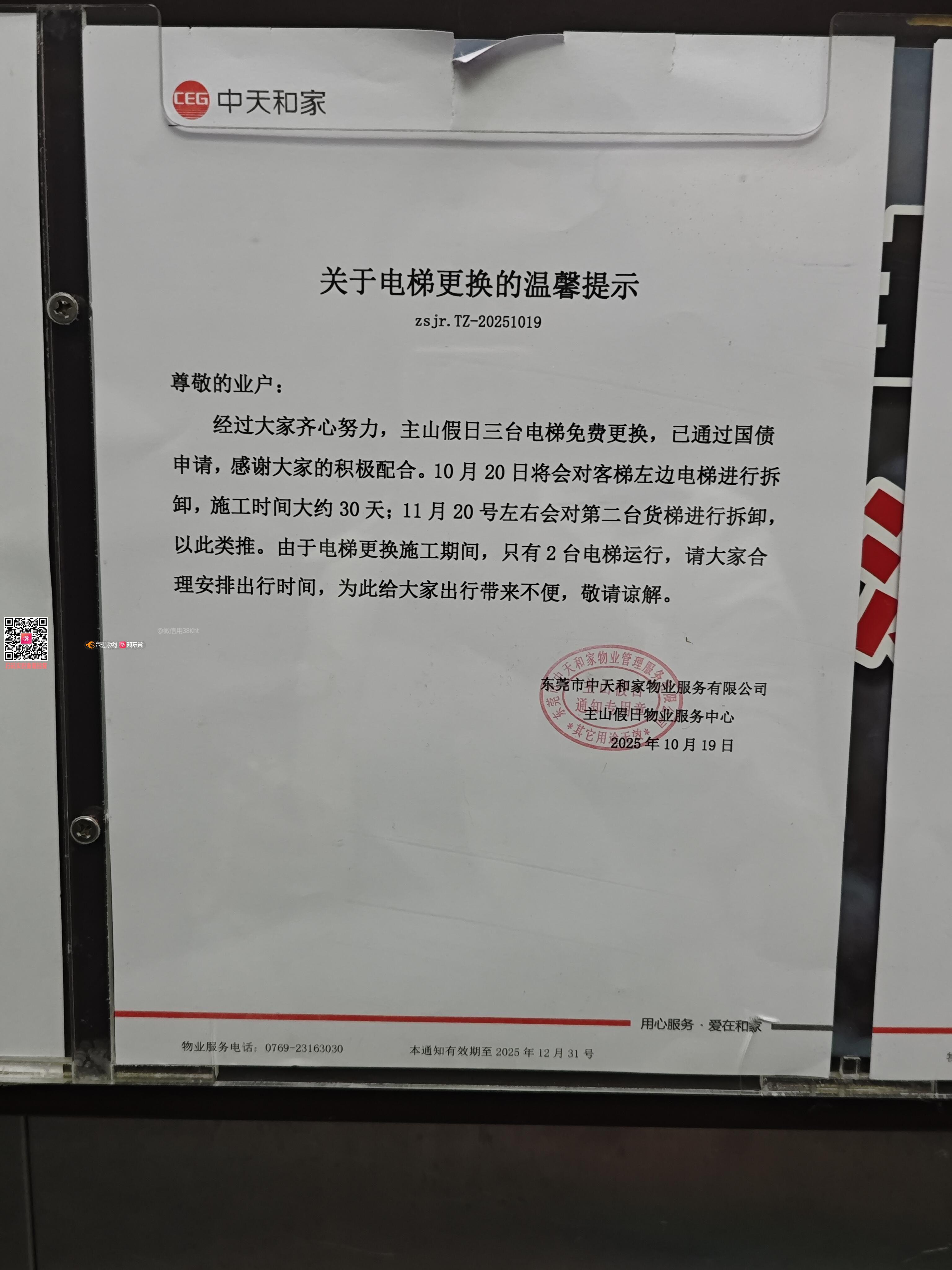 主山假日原本有两辆客梯一辆货梯,按照原定计划在10月20日进行第一辆客梯的更换,周期为30日,但在11月30日,第一辆客梯并未如期投入使用,且按原定计划对货梯开始拆卸更换,现在已经是12月14日,整个主山假日小区仅有一辆客梯可以使用,早午晚高峰期,多数住户都是爬楼梯出行,极其不方便。在这两个月内,物业正常收缴物业费,但并未提供合适的出行保障。