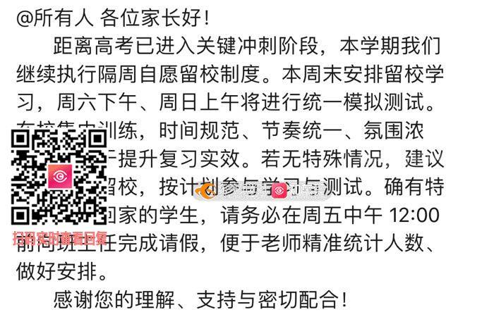 尊敬的市民: 您好!来件已收悉,感谢您对东莞教育的支持。根据您反映问题,现回复如下: 根据国家、省关于中小学减负工作的相关要求,我市严禁所有高中学校组织学生在法定节假日、寒暑假进行集体补课。同时为满足高三年级实际备考需求,学校可以开放教室、运动场等场所供有需求的学生自愿留校自习或锻炼,但严禁在此时间段进行补课。 我局已要求学校做好教师培训,准确执行政策要求,并向学生、家长准确解读政策要求,不得以任何形式强制或变相强制学生周末留校。如您遇到周五离校不被批准或只允许生病才能请假的情况,请拨打基础教育与信息化科电话28330830反馈具体班级信息,我局会严肃处理。感谢您的理解与支持!