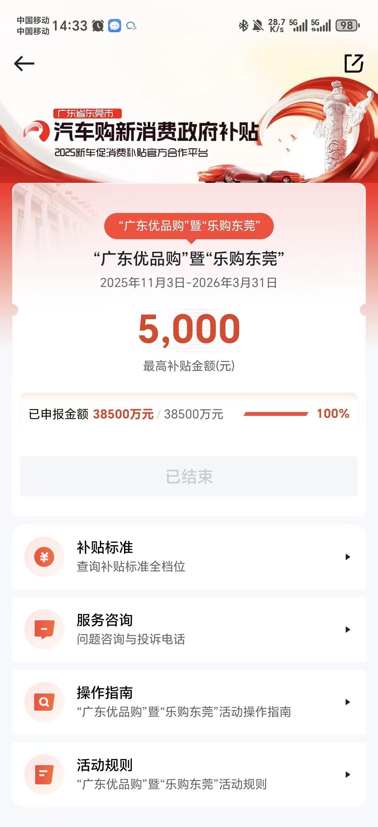 我于2026年1月31日购车,2月2日在懂车帝平台创建申领订单并通过“平台初筛”环节,之后一直卡在政府终审平台至今没有进展,有几个问题想咨询一下: 1、请问乐购东莞活动是在懂车帝平台提交了订单,通过平台初筛之后就锁定了名额吗?目前懂车帝平台显示“已申报金额38500万元38500万元”“活动已结束”,我是否还能领到补贴? 2、活动资料审核周期大概多久,为什么提交了订单迟迟没有进展?目前懂车帝平台显示活动已结束,已无法点击查看自己申领情况,是否还有其他渠道查看? 3、如果名额已经用完,我这种情况无法领取到补贴,那前期申报量大却卡审核、显示还有余额让人购买却实际领不到补贴,是否活动本身有机制漏洞或者存在骗人在东莞购车的嫌疑?