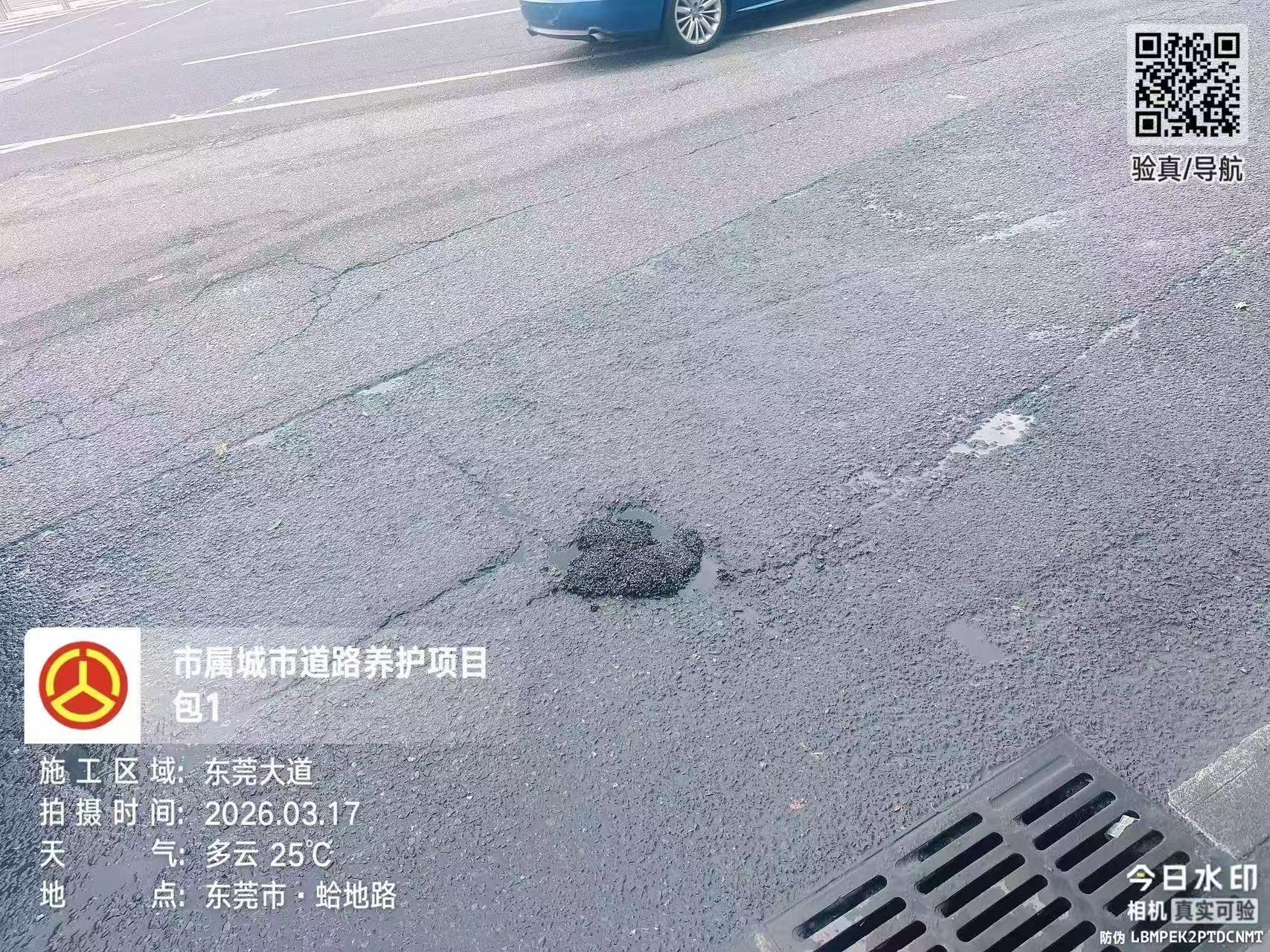蛤地路转东莞大道斑马线前路面破损,有深坑,影响车辆通行。