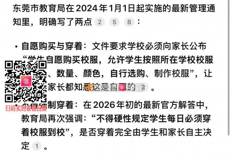 第一,关于校服管理的问题。最近天气变冷,我家孩子没带校服,里面只穿了夏季校服,因为怕冷,外面穿了自己的外套保暖,没有穿秋季校服外套,结果被检查的扣了班级管理分。孩子回来特别难过,一直在哭。我了解了才知道,孩子的级长规定冷了必须穿校服外套,穿自己的外套哪怕里面有夏季校服都不行,严重怀疑学校引导学生必须买秋季校服外套,可是教育局规定不是不能强制买校服吗?孩子的自尊心很强,因为穿了夏季校服还被扣分这件事心情很差,不想上学,也没法安心学习。我在网上查过,教育局没有规定天冷不能穿自己外套,而且孩子说,学校其他年级都不查这么严,只有她们年级天天查、天天扣分,孩子觉得很不公平,心里压力很大。我们做家长的,只希望孩子穿得暖和、不生病、能安心读书,不是不遵守校规,只是希望管理能更人性化一点。 第二,关于早读的问题。我了解到东莞市教育局已经明确取消早读,但是虎门四中现在还是要求学生强制早读,早上7点15分就要到班,年级也安排干部严查,没读单词就扣分。孩子每天要早起,睡眠不够,上课精神不好,长期下去对身体和学习都不好。学校没有按照教育局的规定执行,我们家长很担心。 第三,关于宿舍管理过于严苛的问题。孩子反映,别的楼层宿管阿姨都很温柔,只有自己楼层的阿姨态度很凶,动不动就拿扣分威胁学生,还经常向班主任投诉学生。孩子说不是自己卫生搞不好,是因为要赶去早读没时间搞,阿姨早上七点就不让留在宿舍了,起床晚一点就根本没时间整理好内务,一被投诉就被班主任批评,孩子每天都提心吊胆,完全没有心思学习。