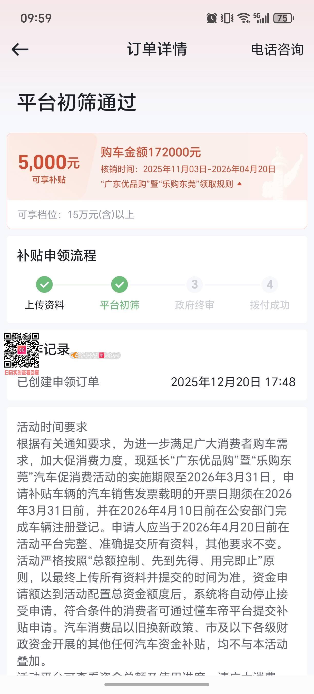 亲爱的各位领导 本人于2025年12月申领东莞乐购焕新补贴,并于12月完成购车,并于2026年1月份上完车牌等手续并按要求在懂车帝完成资料提交,初审在3个工作日内已经完成,但从1月份到3月15日的今天还是停滞在平台初审状态,我是担心领导们因审批工作繁忙把我这个单漏了,特向领导们咨询,我的审批进度是正常的吗?为什么我看有的人很快就走完所有流程?经济下行收入非常不稳定,可否帮忙推进?万分感谢