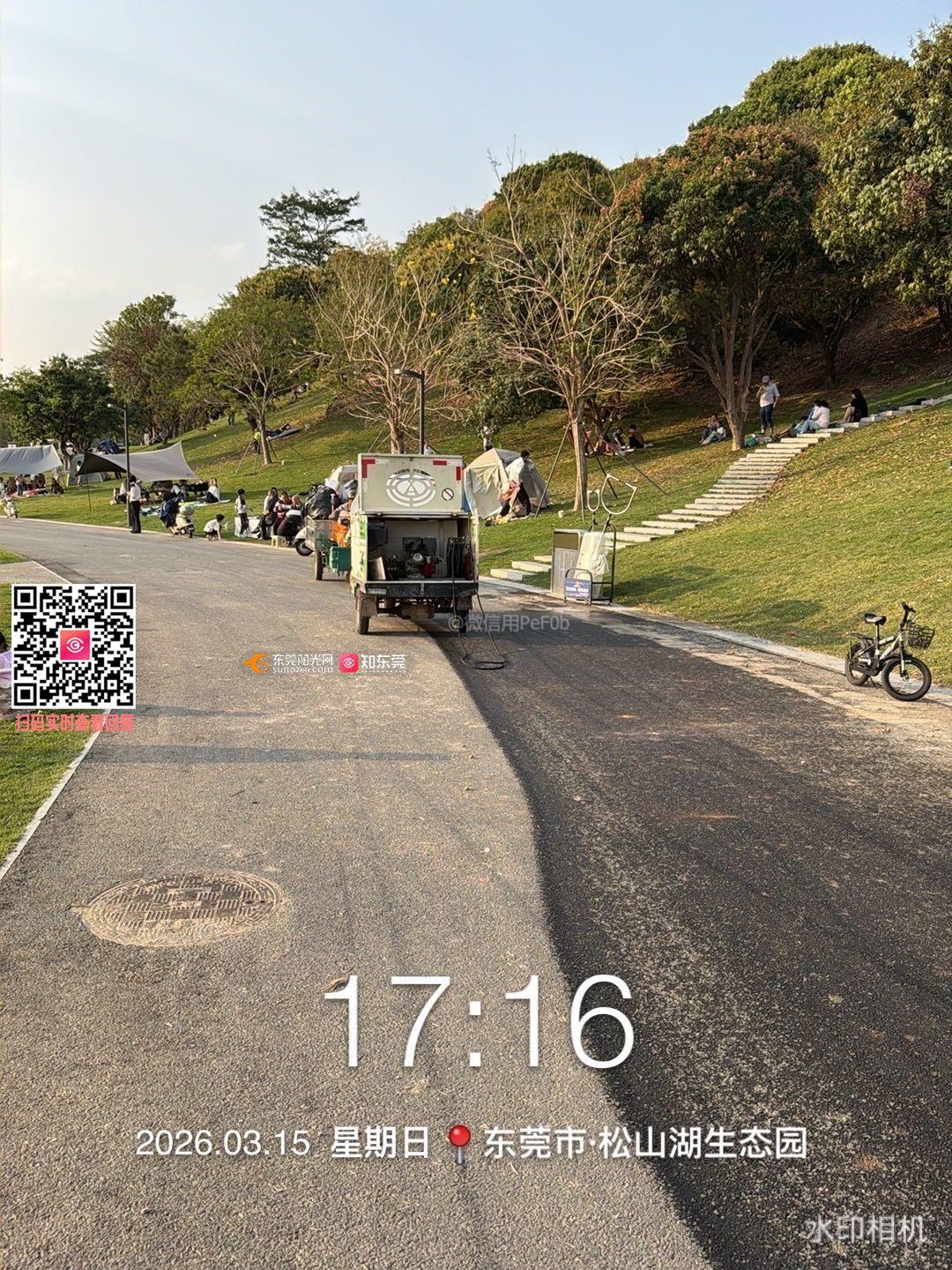 为什么要在周末人流高峰期进行高压洒水清洁?草坪不允许游客游玩?洒湿了更好玩?地面,草坪湿了,空气全是柴油味,这就是松山湖文旅想要的结果吗?不欢迎游客可以不宣传,但请别用这种令人恶心的方式。