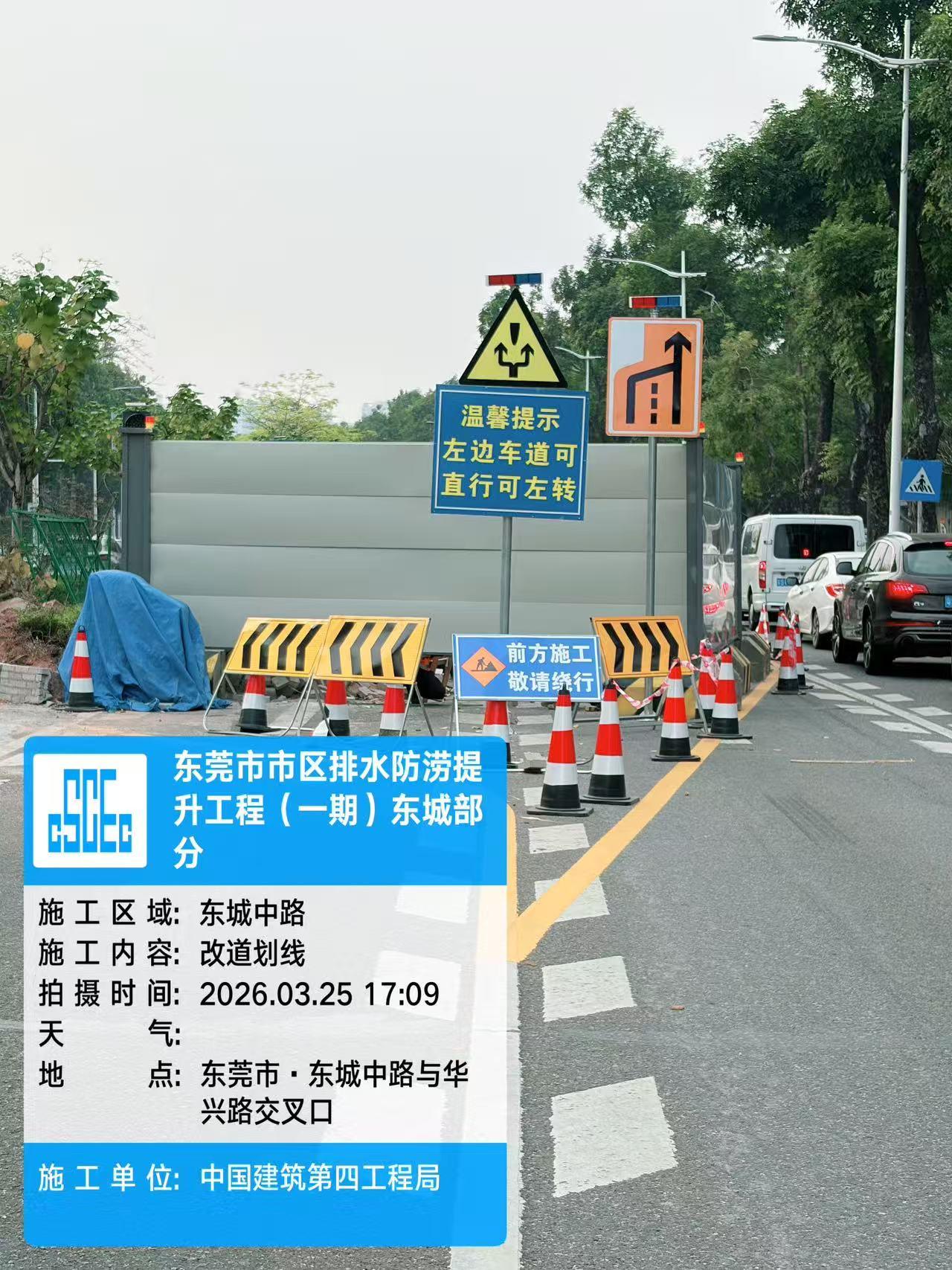 尊敬的市民:您好!您反映的相关问题我们已收悉,现将处理情况回复如下:收到您的反馈后,我们已于 2026 年 3 月 23 日与您电话沟通,该路段施工内容为东莞市市区排水防涝提升工程(一期)东城部分新建雨水箱涵和雨水管道,因项目分段施工,具体围蔽完工日期详细情况可通过东莞东城微信公众号相关内容进行了解(https://mp.weixin.qq.com/s/LOZlOmd9XMiB9kYiiBs1uw)。我单位已组织施工单位优化调整交通疏导方案、施工围挡布设(绕行提示),做好围蔽措施及防尘措施,尽最大努力减少对周边通行的影响。下来,我们将建立常态化交通监测机制,持续关注现场车流量及拥堵情况,根据实际动态优化交通组织方案,同时严格落实交通疏导措施,规范设置交通引导、警示及分流标识,并安排专人负责现场交通疏导,引导车辆及行人安全有序通行,全力保障道路通行安全、顺畅。感谢您对我们工作的监督与支持,给您带来不便敬请谅解!