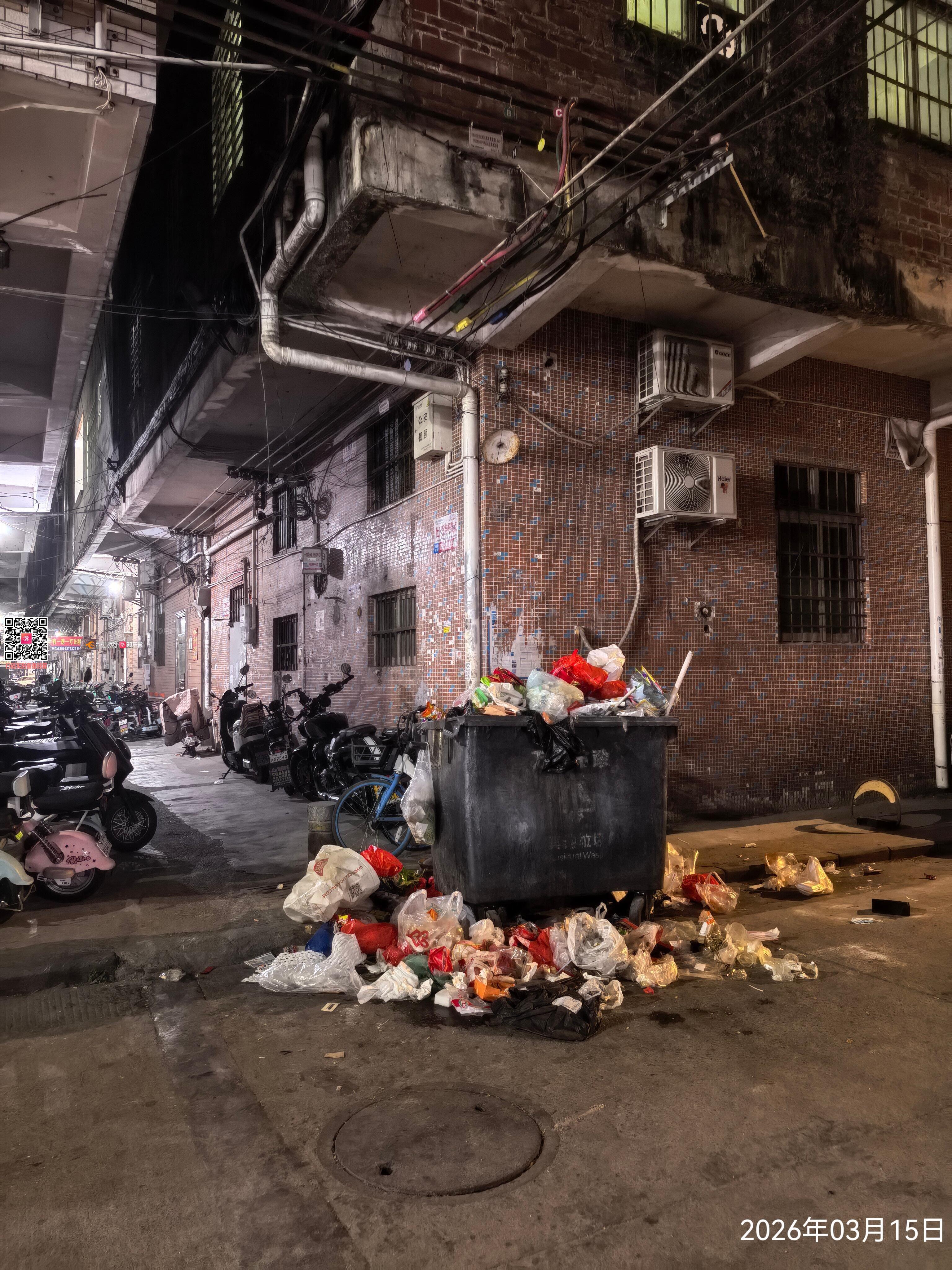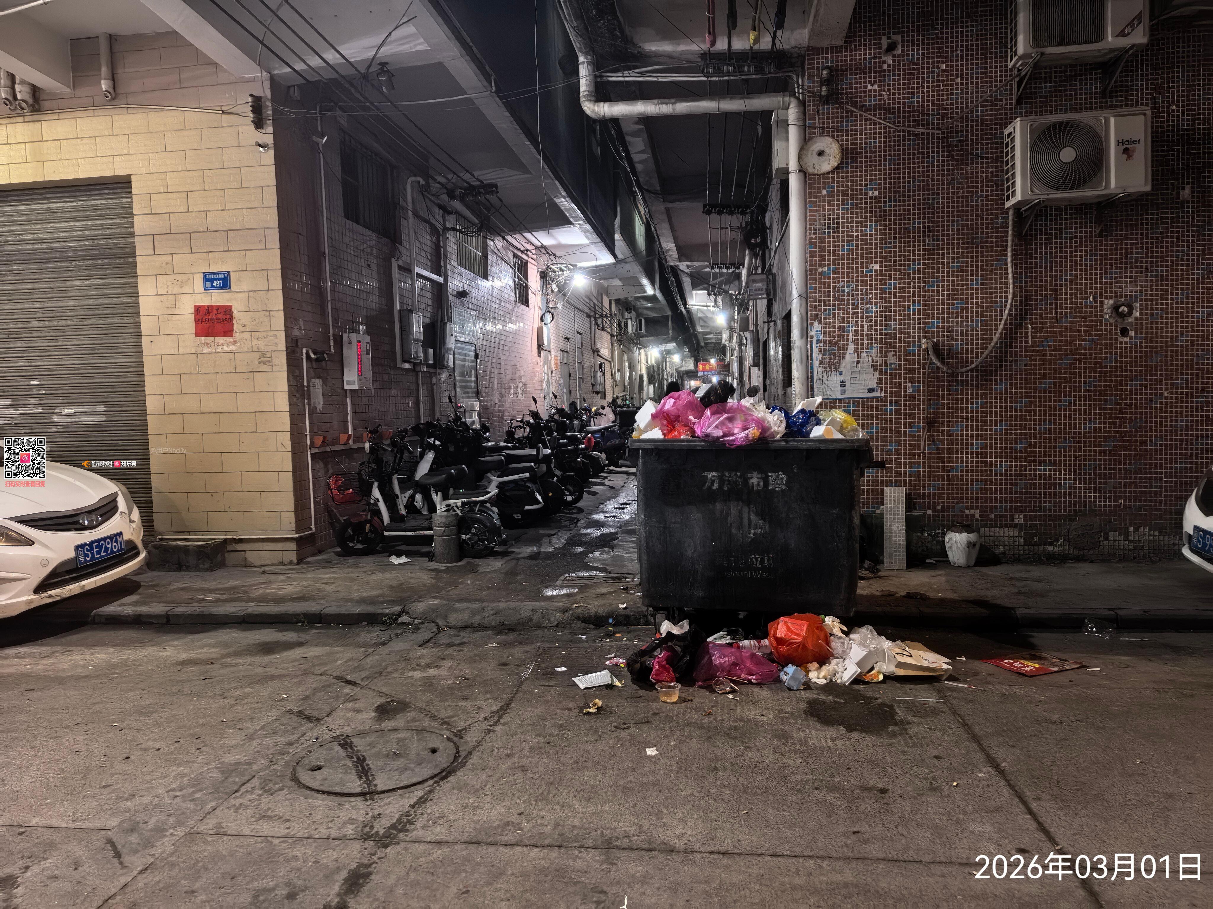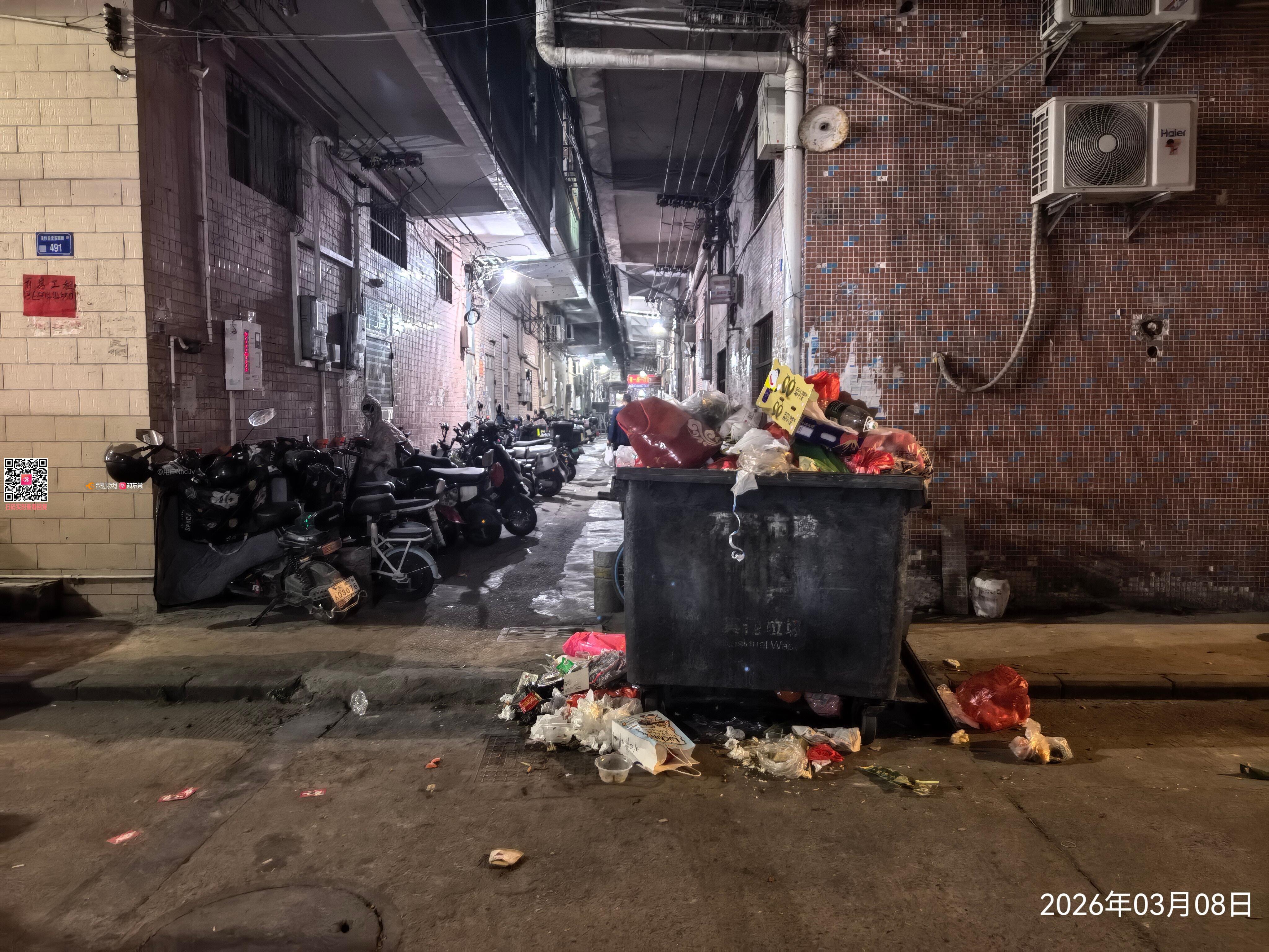 高埗镇冼沙星光东四街491号后门垃圾桶处于满溢状态,特别是晚上垃圾超级多,垃圾散落、厨余乱倒,不仅散发出难闻的异味(夏天异味让人难以承受),还吸引了大量蚊虫(天气回暖,这里为蚊虫提供了繁殖场所),凌晨时段人流少时很多老鼠从垃圾桶下面的下水道跑出乱串,经过此处时常被老鼠吓到,每天进出需经过此垃圾桶都很不方便。这种现象不仅影响了周边环境的卫生整洁,还对居民的健康构成了潜在威胁,希望相关部门能够移走这个垃圾桶并彻底消杀,谢谢!