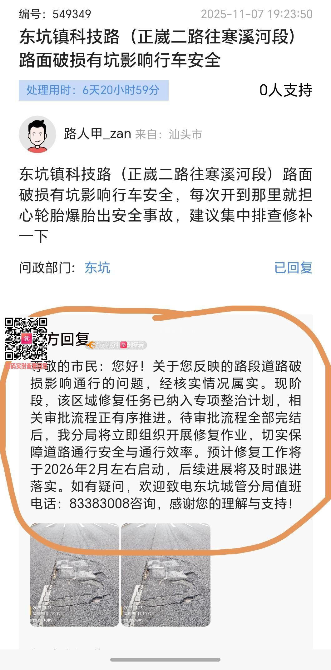 2025年11月已反馈该路段路面多处严重破损问题,该位置路面破损截止已持续至少一年半以上未修补,官方回复2026年2月左右启动修复,截止目前已经三月中旬接近下旬,仍未见启动修复,请当地政府组织实地勘察解决老百姓真正的需求,降低行车安全风险。