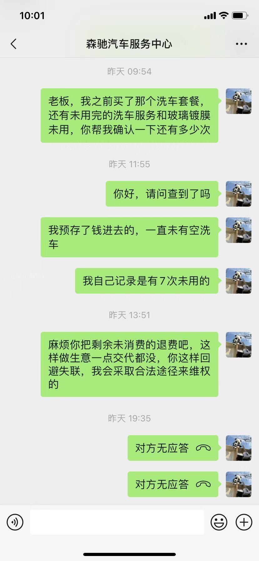 本人于2021年11月21日购买森驰汽车服务中心(麻涌分店)推出的380元洗车套餐(包含10次洗车、1次打蜡、一次消毒服务),由于本人因工作原因长时间不在麻涌,截至2026年3月20日本人累计消费此套餐的洗车服务3次,余7次洗车服务及1次打蜡未消费,遂向此店实际经营者(其自称为明哥,全名对方未告知)的微信确认未消费的情况及退出退费请求,但遭到实际经营者的无视,拒不回消息对待,同时本人致电其移动电话,其让家属接听并表态打错电话,在本次预存消费里,本人蒙受实际经营者的消费欺诈,收钱后拒绝提供服务及售后疑问,本人提出把未消费的服务按公允价值核算后退回到本人账户,请相关监管部门给予帮助和协调,金额虽不大,但这个严重影响消费者的权益,我深信仍有不少车友遇到同样的困扰,希望监管部门能有效的遏制这种老赖风气,给我们最无辜的消费者一个公道,谢谢!