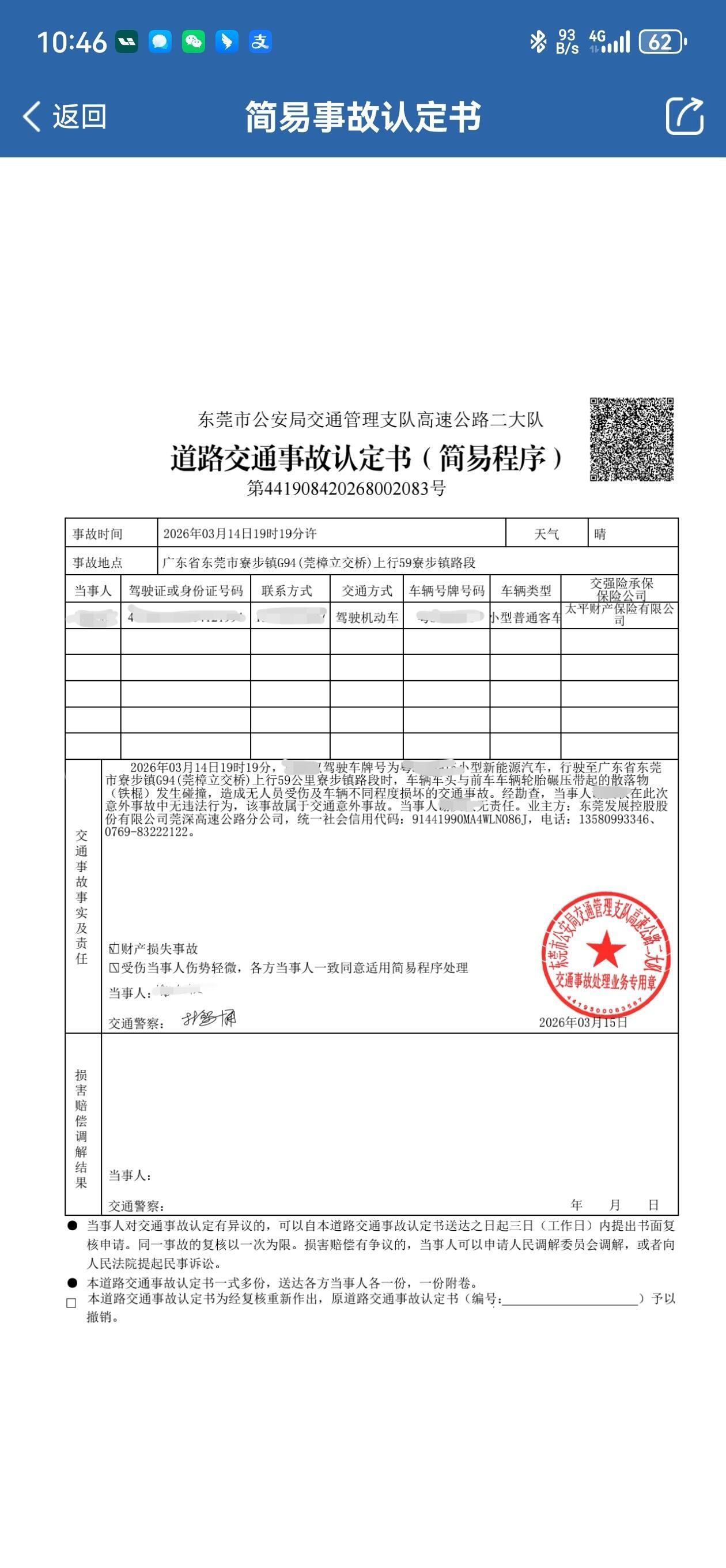 本人于2026 年 03 月 14 日 19 时 19 分,驾车行驶至广东省东莞市寮步镇 G94(莞樟立交桥)上行 59 公里寮步镇路段时,车辆车头与前车轮胎碾压带起的散落物(铁棍)发生碰撞,造成车辆不同程度损坏的交通意外事故。 经东莞市公安局交通管理支队高速公路二大队出具《道路交通事故认定书(简易程序)》(编号:第 441908420268002083 号)认定:本人在此次事故中无违法行为、无责任,事故系路面散落物未被及时清理所致,责任主体为东莞发展控股股份有限公司莞深高速公路分公司。 事故发生后,我并多次通过电话(13580993346、0769-83222122)与该公司沟通赔偿事宜,但对方始终推诿扯皮、拖延处理,明确拒绝赔付我的车辆维修损失,严重侵害了我的合法权益。 依据《民法典》第 1256 条及《最高人民法院关于审理道路交通事故损害赔偿案件适用法律若干问题的解释》第 7 条,收费高速公路经营者负有保障道路安全畅通的法定义务,因路面散落物导致交通事故,管理方不能证明已尽到及时巡查、清理、防护义务的,应当承担赔偿责任。该公司作为莞深高速的经营管理方,未履行道路清障保障义务,理应依法承担赔偿责任。 现正式向贵单位投诉,并提出以下诉求: 1.责令东莞发展控股股份有限公司莞深高速公路分公司限期核实事故与损失,依法全额赔付我的车辆维修等合理费用; 2.督促该公司完善道路巡查与清障机制,加强路面安全管理,杜绝同类安全隐患再次发生; 3.请贵单位就本次投诉的处理进度与结果,向我进行书面反馈。