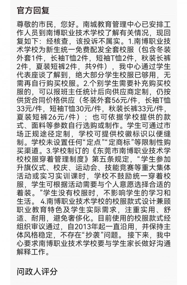 此前关于东莞市南博职业技术学校校服问题的问政,以及南城教育管理中心的官方回复,此回复完全回避核心违规事实,用模糊话术搪塞公众,现向市教育局反映,恳请介入核查。 根据东莞市《关于进一步加强我市中小学校服管理工作的通知》(东教〔2023〕28号),明确要求“允许学生按照所在学校校服的款式、颜色,自行选购、制作校服”,且“不得采取‘定点’‘定商标’等方式干涉交易”。但南博职校的校服在淘宝、京东等平台及市场均无售卖渠道,学生及家长除向学校指定渠道购买外别无选择,即便回复声称“可自行选购”,也无任何可落地渠道,本质仍是垄断强制交易,“校服已够用”不过是转移焦点的诡辩,政策约束的是交易选择权,而非是否免费配发,这种偷换概念完全无视政策核心。 更值得警惕的是,该校校服存在明显抄袭:长裤照搬“深圳校服”款式,外套仅更换校徽便全盘复制东莞市可园中学校服(外套和夏季短裤完全照搬可园中学)。官方以“沿用多年”否认抄袭,是对“贴合东莞地域文化特点”政策导向的公然漠视,抄袭让校服丧失身份标识意义,“沿用风格”绝非违规挡箭牌。 南城教育管理中心的回复通篇回避核心问题,用无关细节搪塞,本质是懒政怠政,践踏公众知情权与政策严肃性。望相关部门正视问题,依据相关规定核查南博职校违规行为,避免基层部门用形式主义掩盖问题,维护政策严肃性与学生家长合法权益。