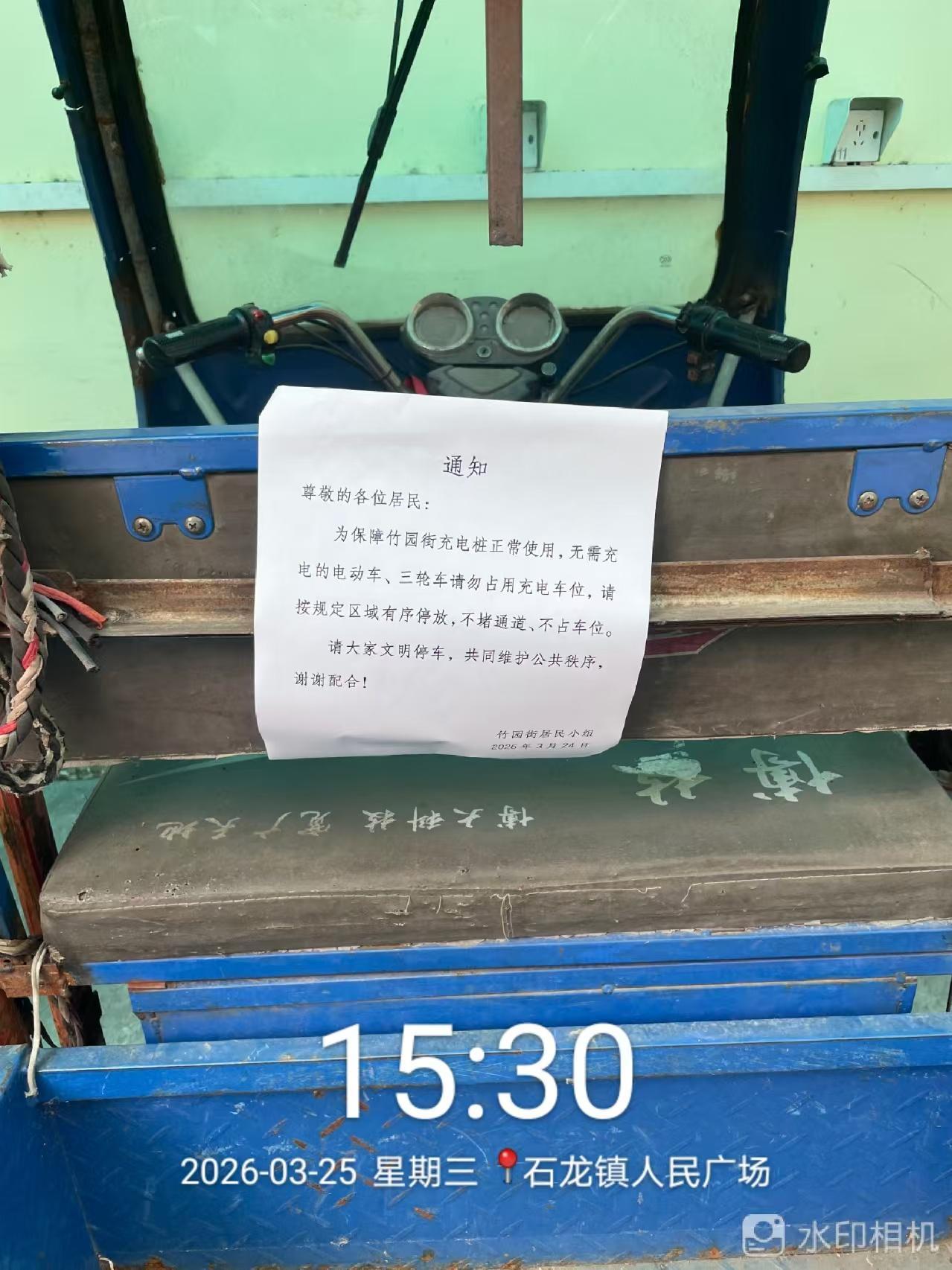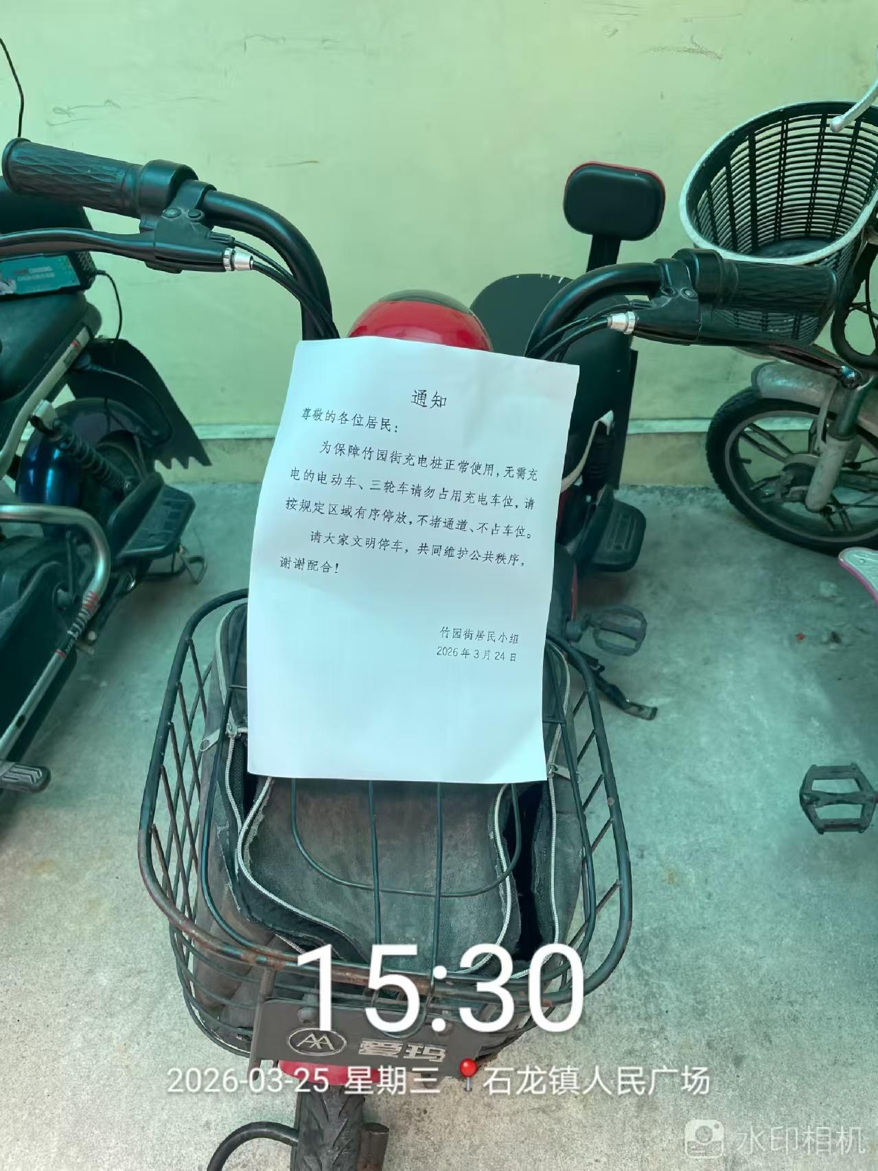 石龙镇中山东社区竹园街电瓶车公共充电站管理差乱,本来地方就不多,很多不是充电的电瓶车和烂单车停在那里占地方,另外还有起码3辆三轮车长期霸占位置,向分会反映均无处理,严重影响附近居民电瓶车正常充电和火灾安全。