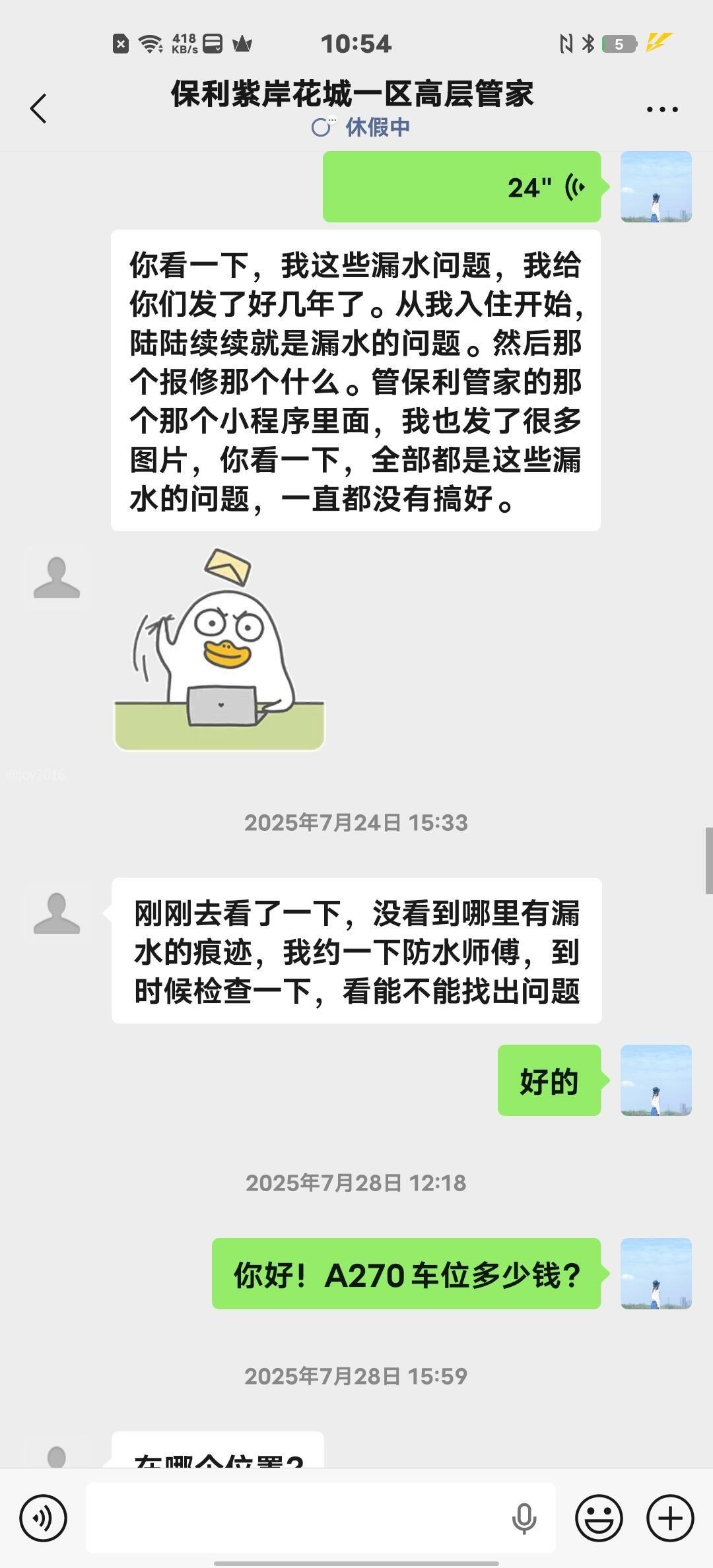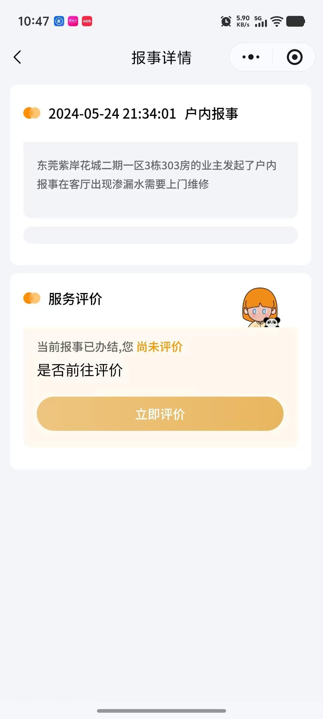 一,2024-5-24业主报事:东莞紫岸花城物业服务中心,紫岸花城一区3号楼303号房屋内地面有渗水痕迹(隐蔽工程),当时工程部人员只是过来看后没处理。 二,2025-7-24业主跟踪:紫岸花城一区3号楼203号反馈花天因楼上渗水脱落,物业人员上门查看,反馈我家没有漏水明痕(隐蔽工程),后回复先安排人员处理防水,但一直没有过来处理。 三,2026-3-26业主跟踪:物业人员回复已过保质期五年。 交楼时间:2019-8月,其实从交楼开始,一直都有陆续反映(洗手间、窗户)渗水问题,当时一直当外墙窗户渗水处理,直到现在仍然没有找到问题点。