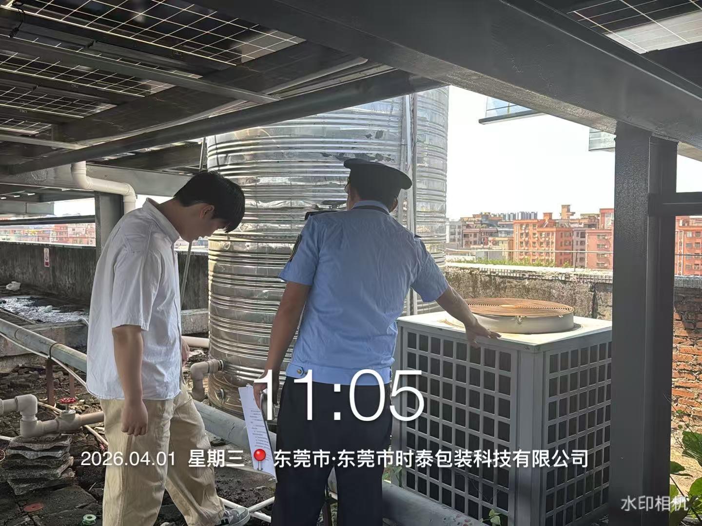 尊敬的市民: 您好!您反映的问题已收悉,现回复如下: 一、基本情况 经调查,您反映的单位全称为东莞市时泰包装科技有限公司,位于东莞市高埗镇三塘东路8号1号楼,已领取营业执照,主要从事纸盒加工生产。 二、存在环境问题及处理情况 2026年4月1日,高埗生态环境分局工作人员到现场进行检查,该单位设有手工组装、包装等工序及相关设备;现场检查时,该单位正在生产,宿舍楼顶热水器存在轻微振动及一定噪声。鉴此,高埗生态环境分局工作人员责令该单位加强日常管理,做好设备减震措施,防止噪声扰民,同时高埗生态环境分局将定期对该单位进行复查监督。 上述有关情况,高埗生态环境分局工作人员于4月1、2日多次致电您了解情况,您电话均无法接通。为妥善解决问题,如您对该单位发现新的举报线索,可拨打高埗生态环境分局举报服务热线:0769-88871315进行反映,高埗生态环境分局将尽快派员调查处理。 感谢您对我们工作的理解和支持! 东莞市生态环境局高埗分局