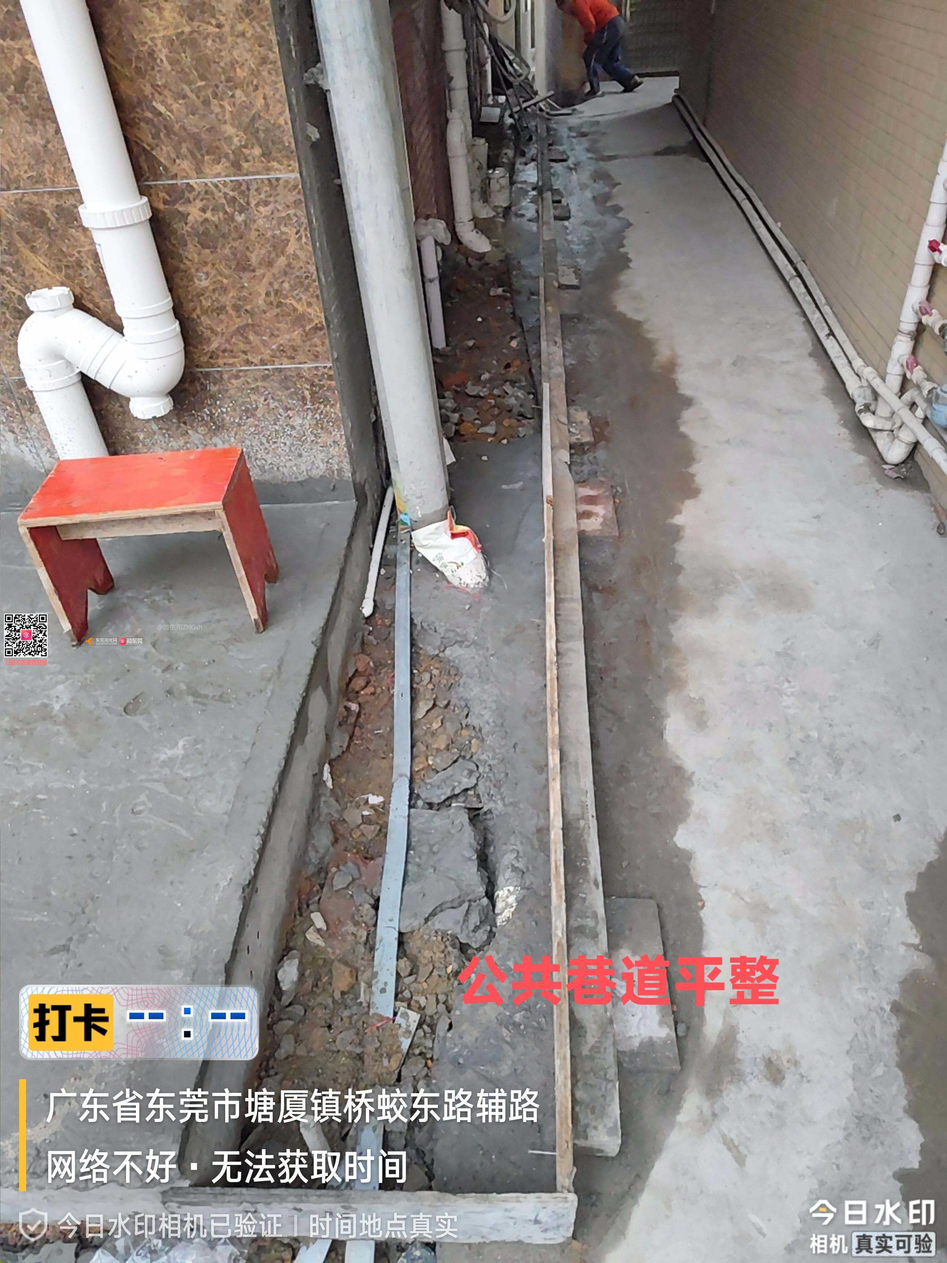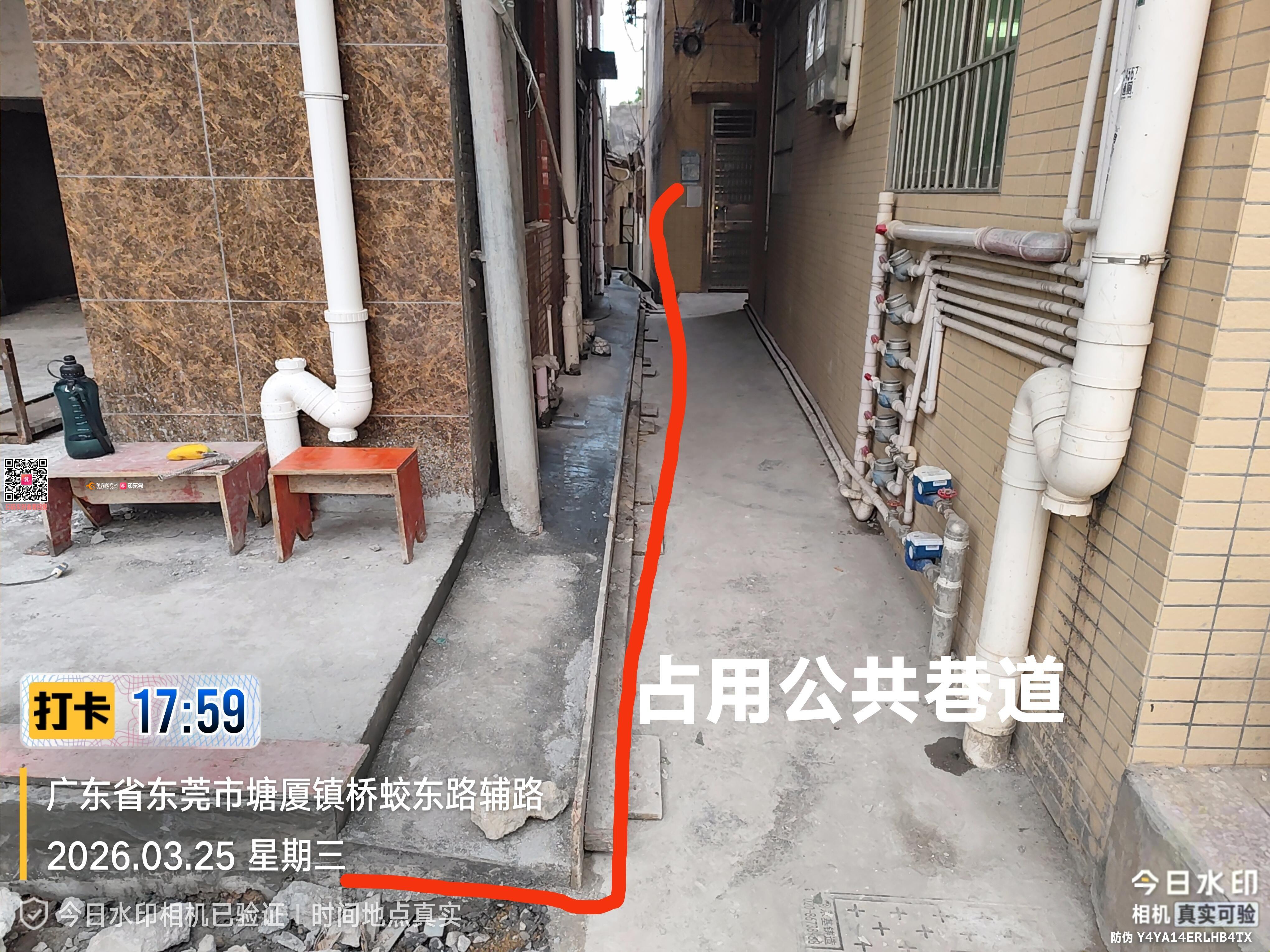 塘厦镇石鼓旧墟巷1号装修期间违建:1.将原来整栋5层违规加建至6层以上;2.一面墙向外跳出40-50厘米;3.把公共巷道占为己有