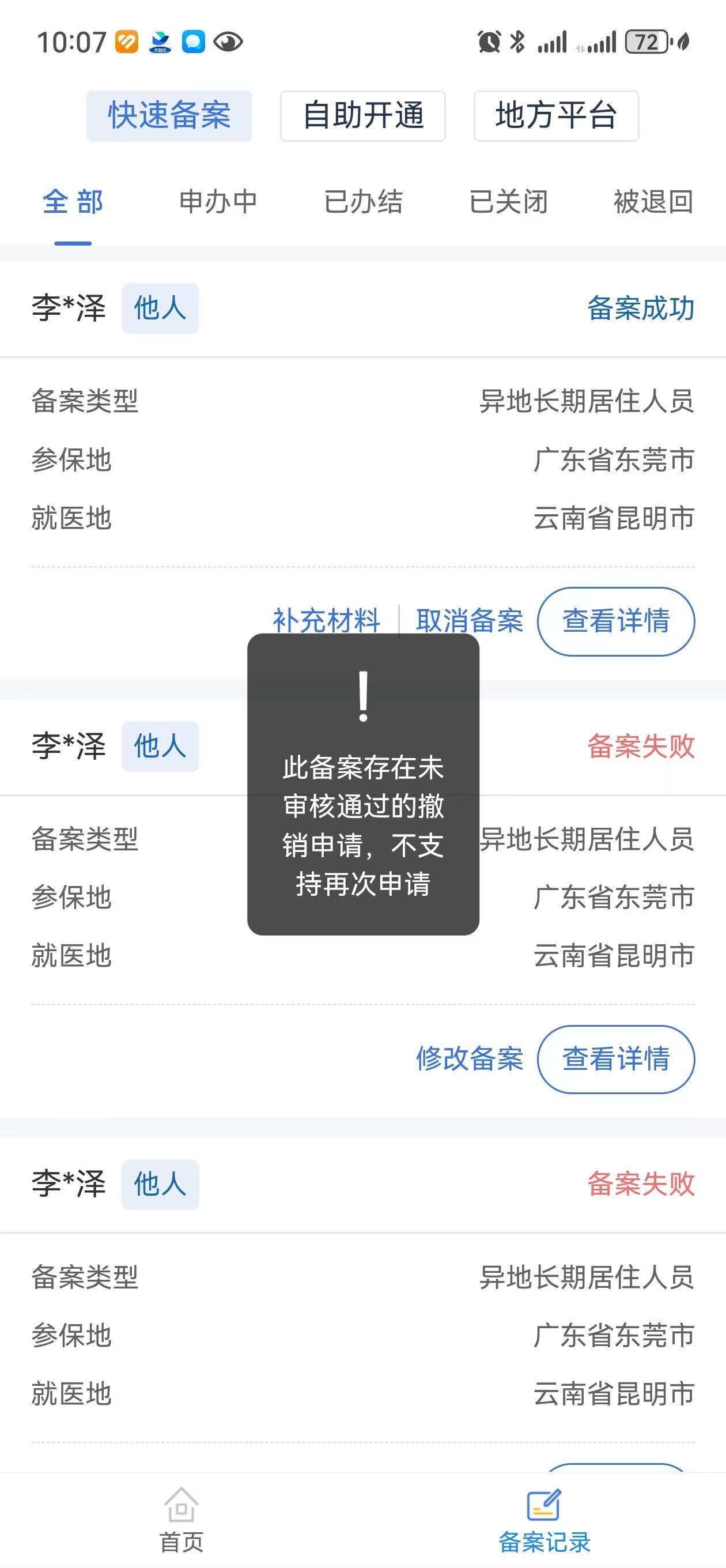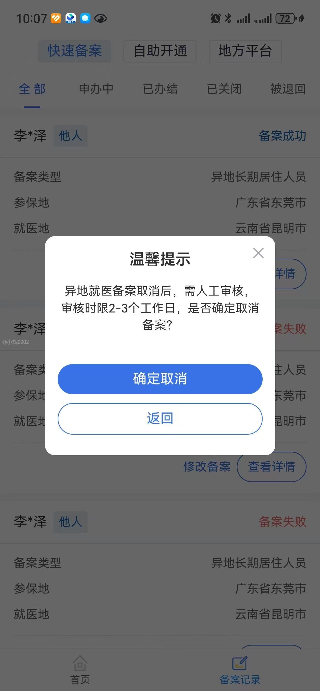 1.东莞医保异地备案之后不能在本地门诊使用医疗保险 2.取消备案需要线上审批,咨询之后需要医保归属地医保局审批,41在国家医保服务APP申请取消,提示2-3个工作日审批结束,48日还没审批; 3.这种效率,如果只是一些小病急病无需住院的,生病的时候还要等取消审批么?怎么保障居民合理使用医保权利? 4.如果是一些特殊门诊,需要异地两地跑的,不能天天申请,再取消,再申请,再取消吧? 5.拨打医保归属地医保局松山湖的电话,一直忙线,根本打不进去 6.少儿医保无法通过线上查询参保状态