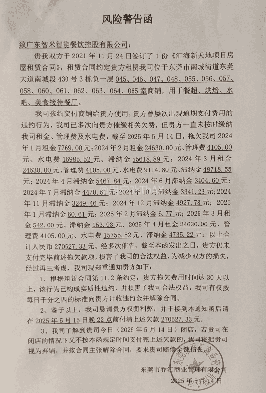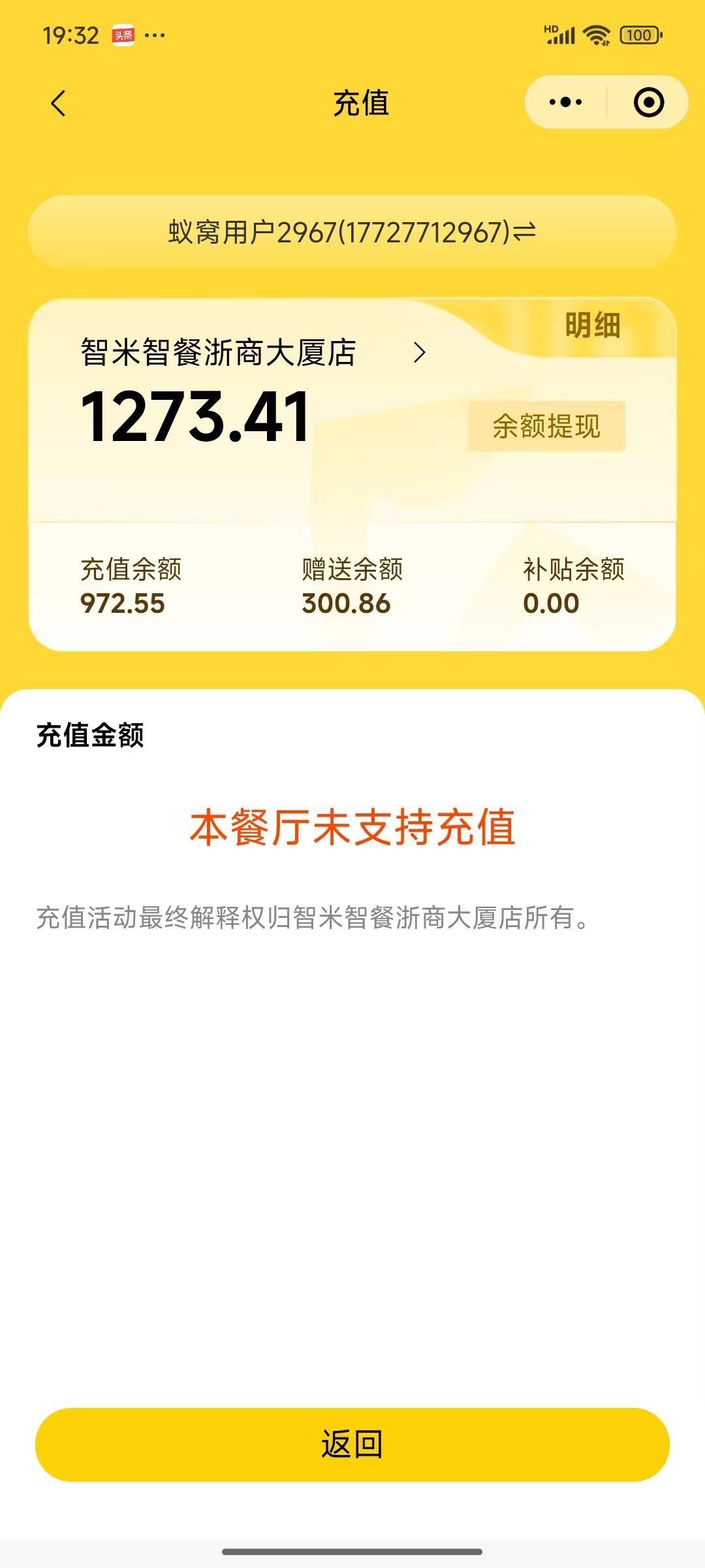 我是东莞市南城区浙商大厦楼上某公司的职员,午餐通常在广东智米智能餐饮控股有限公司旗下智能餐饮品牌——智米智餐浙商大厦店消费解决,为了点餐方便,所以绑定了手机号成为智米智餐浙商大厦店会员。2025年5月7日我在会员余额不足的情况下充值1000元(送288元),但在2025年5月13日毫无征兆的情况下看到贴出的一张通知说餐厅升级,暂停营业,13日中午12:16打客服电话18566933899询问,得到回复说是线路出现问题,要修复。但在2025年5月14日下午的时候,看到东莞市乔汇商业管理有限公司贴出的风险警告函,才得知广东智米智能餐饮控股有限公司欠该公司款项27万多,故5月14日晚上,我在智米智餐浙商大厦店的APP(蚁窝AI)上申请提现972.55元(赠送的余额288元冻结不可提现),但对方一直未予审批处理。象我这样的充值个体并不少,恳请相关部门督促广东智米智能餐饮控股有限公司尽快退回我们消费者的相关充值余额,感谢为盼!