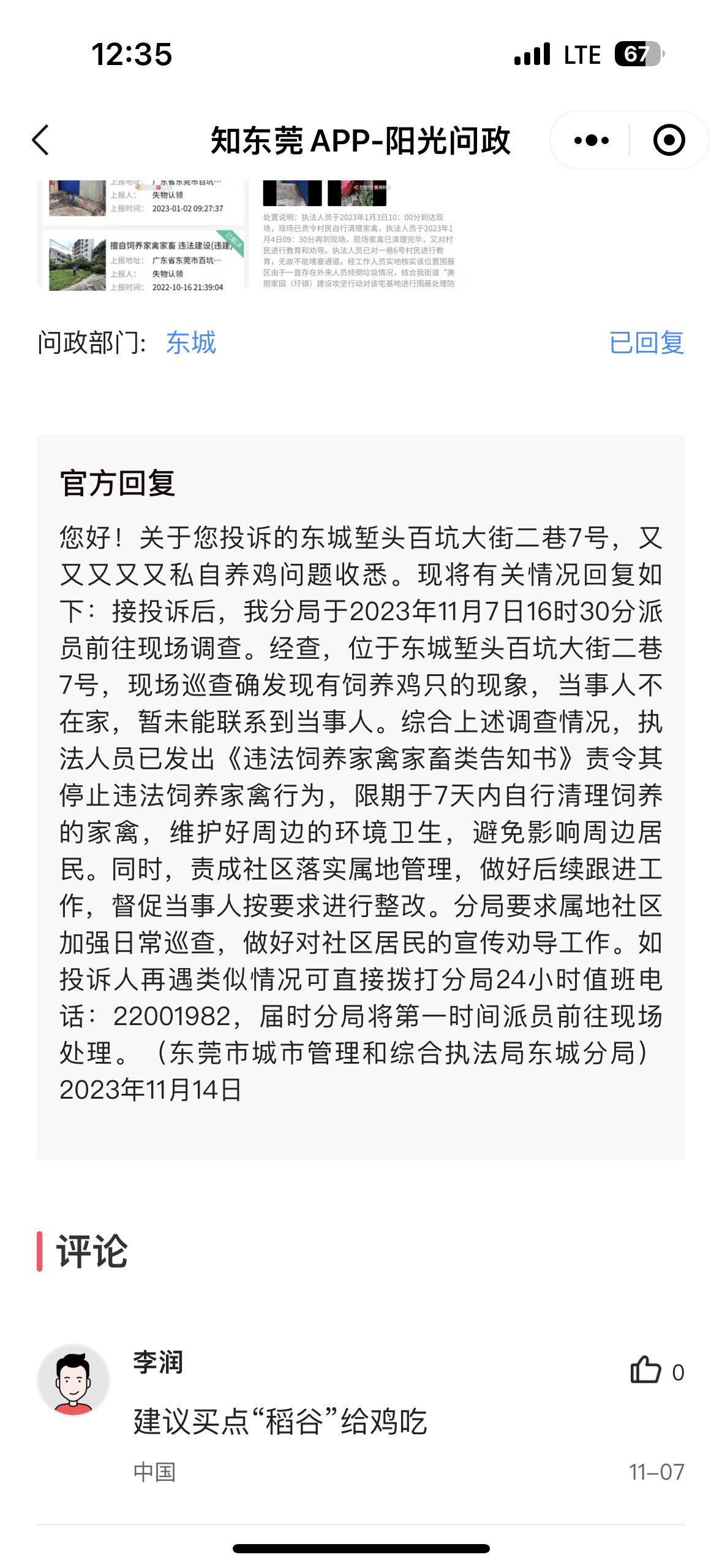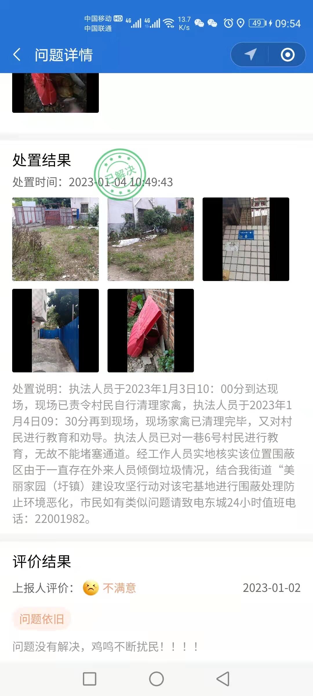 #环境污染#工作人员,收到投投诉后只是走个过场!并没有把问题解决!!已经过去7天有余!在这些天里,从末看见有工作人前来所谓的跟进!!而且最近北风吹过,带有一阵阵鸡粪味!每天凌晨鸡鸣声扰民!!多次投诉社区没有处理!!