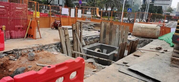 #全域文明曝光台#这个路口修了好久还没有修好,全面封住了行人路过到过不去,天天到不开工,如果行人、电动车行走到要跨车头行走,这种行为非常危险,希望有关部门尽快处理问题。