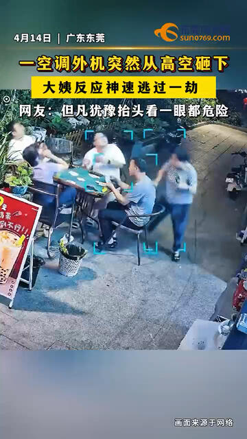 东莞一小区楼外,空调外机突然从高空砸下,楼下大姨反应神速逃过一劫。#高空坠物