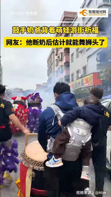 鼓手#奶爸 背着萌娃击鼓游街祈福,网友:从小沉浸鼓点里,他断奶应该就会#舞狮 #传统文化