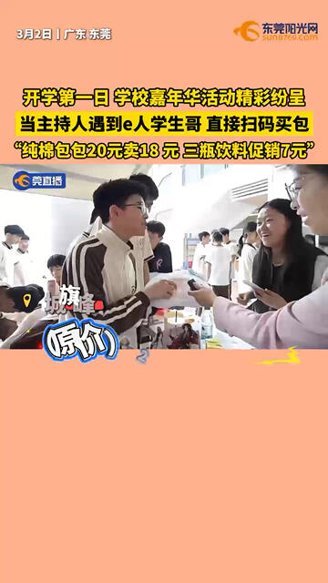 #开学第一日 ,学校#嘉年华 活动精彩纷呈!当主持人遇到#e人学生哥 ,直接扫码买包,“纯棉包包20