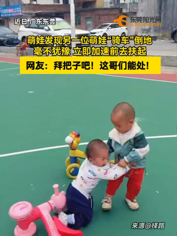 #萌娃 玩耍时发现另一位萌娃“骑车”倒地,随后毫不犹豫立即加速前去扶起,网友:拜把子吧!这哥们能处!